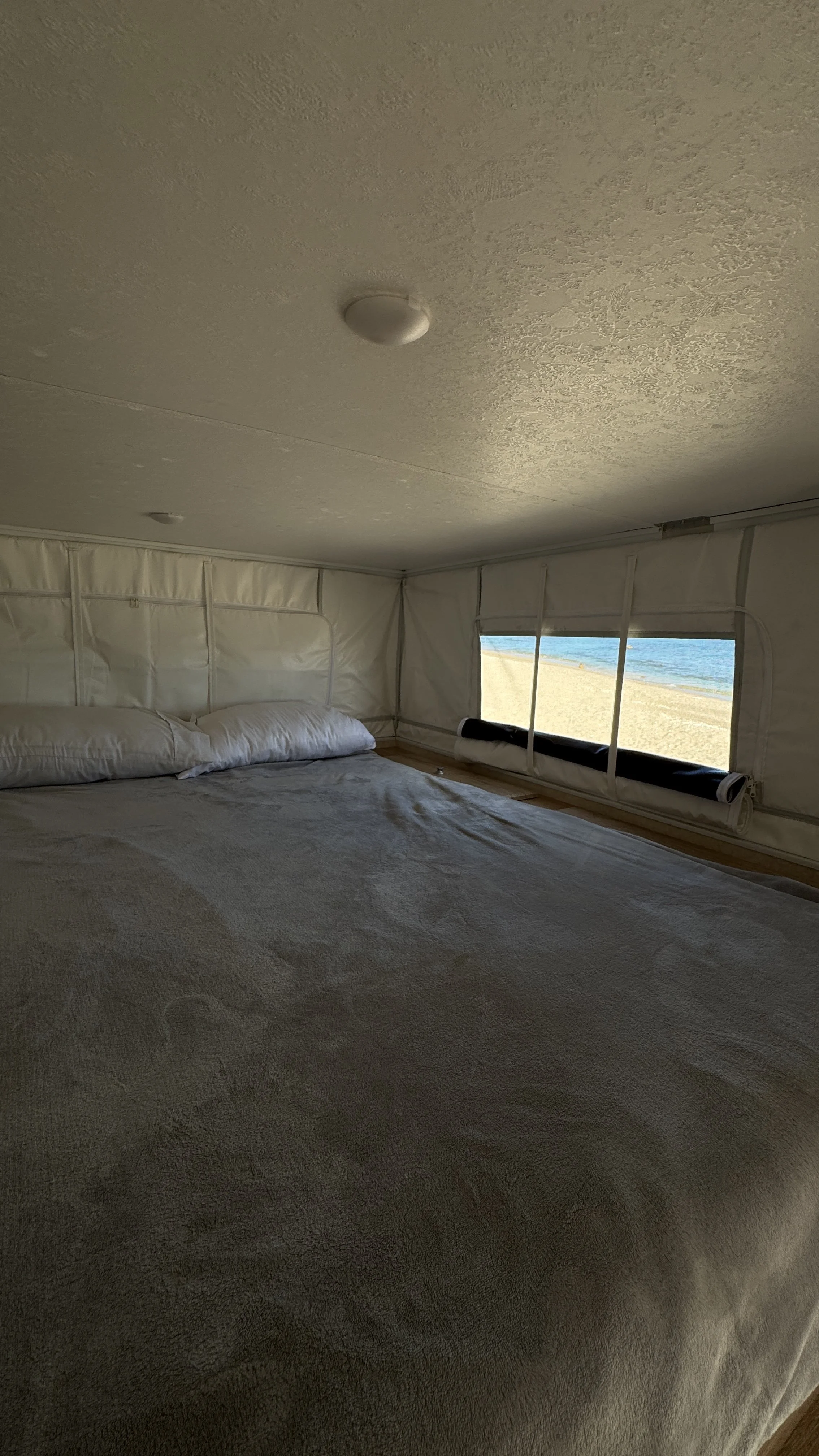 Travels four and sleeps three adults or 2/2 adults/kids with a double bed and a bed-to-table setup. With an interior kitchen fully equipped, a big fridge, and a solar-powered battery, portable toilet, Starlink, and more.